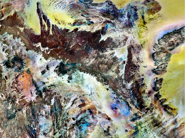 这张图像大致拍摄于2000年前后,作为地区地质调查的一部分,展示的是阿尔及利亚南部塔西里阿尔贾国家公园(Tassili n'Ajjer National Park)的景致。图像中可以看到,红色的原始花岗岩被湖泊切割的零零碎碎,这些湖泊已经干涸,满是黄沙(黄色)。而受到狂风强烈侵蚀的砂岩(棕色)地区还能看到零星分布的盐类沉积(蓝色)。