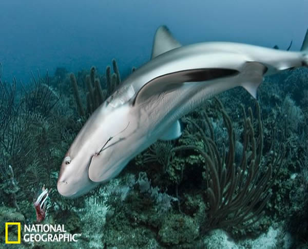 洪都拉斯海域,一头鲨鱼大肆咀嚼到嘴的猎物,尸体碎片不断从口中飞出。狮子鱼早已在加勒比海、美国东南海域和墨西哥湾定居并且数量快速增长,相比之下,包括鲨鱼在内的一些当地物种却面临生存考验。
