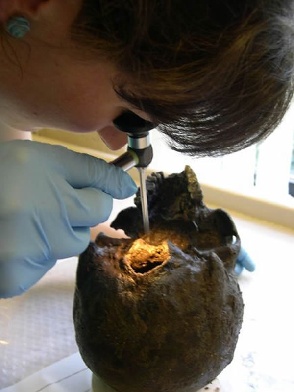 英格兰约克发现2500年前人类大脑 来源: 神秘的地球 时间:2011年4月10日 10:14 3.对其大脑进行研究 对其大脑进行研究 从这张未标明日期的照片上看,约克考古基金会的雷切尔·库比特正在利用内诊镜研究这颗远古大脑。约克大学的考古学家、这篇论文的联合作者马太·科林斯表示,蛋白质分析证实这颗头颅的主人是一名男性,大约生活在公元前673年到482年间。他说:“这个大脑的质量并未发生太大变化,不过它的体积缩小了很多,这是因为它丧失了大量水分。” 上一页1234下一页 上一篇 下一篇