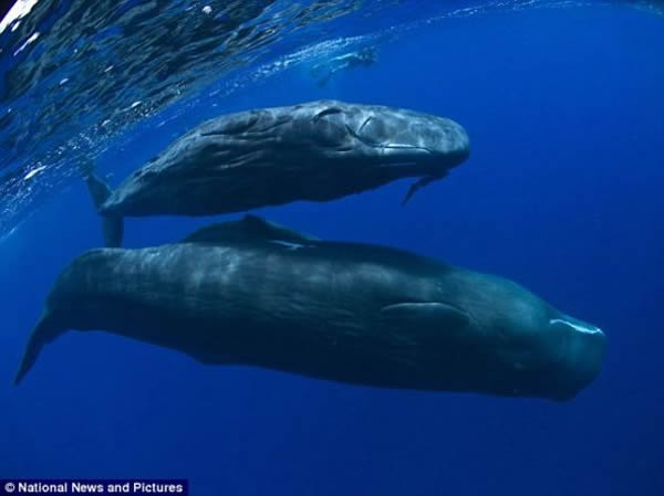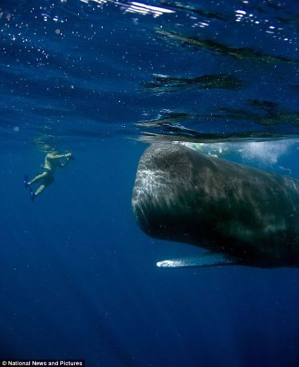 抹香鲸向前游进似乎丝毫不费力气,水面上的摄影师想与之保持同步,而马蒂赛提正从鲸鱼下方进行拍摄。