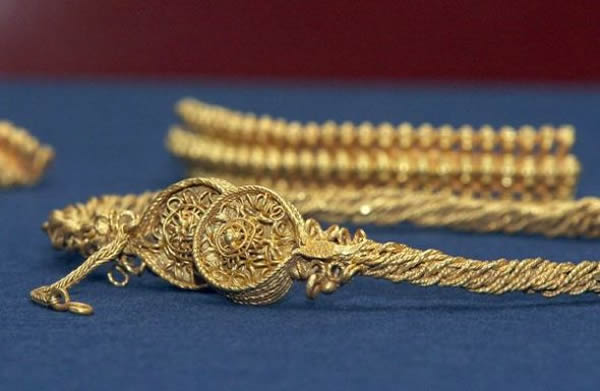 业余寻宝猎人在英国萨默塞特的农田发现5万多枚古罗马钱币 来源: 神秘的地球 时间:2011年4月14日 11:29 4.铁器时代金饰 铁器时代金饰 这件绚丽的地中海饰环以及其他3件饰环保存完好,是在一个木制结构中发现的,可能是神龛。在抵达最终的埋藏地之前,这批金饰一定经历了漫长的旅程,说明当时富有的英国人已开始进行远途贸易。希斯洛普在一份声明中说:“此次发现的饰环价值46.2万英镑(约合74.1万美元),是迄今为止在苏格兰发现的最为重要的铁器时代黄金饰品。” 新浪环球地理(孝文) 上一页1234 上一篇 下一篇