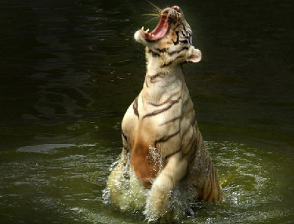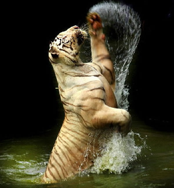 报道称,尽管这些孟加拉虎生活在动物园中,食物很丰富,但在分发食物的时候,它们依然要经过一场“激战”才能抢到“战利品”。在照片中,一只母虎突然跃出水面,露出长牙仰天咆哮,准备抢食管理员扔下的食物。来自澳大利亚新南威尔士的摄影杰弗里·苏里安托在动物园正好抓拍到了这一画面。
