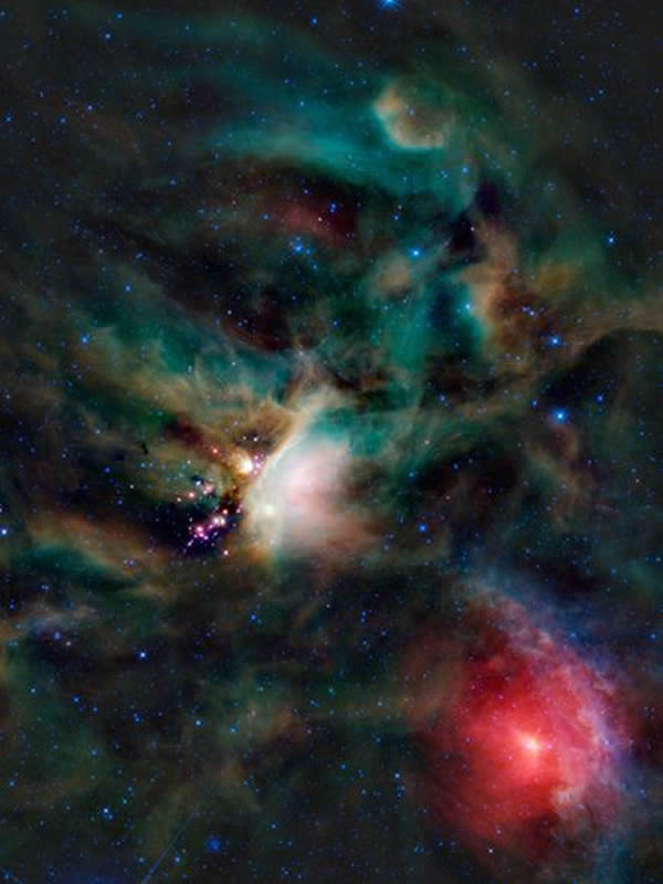 蛇夫座恒星形成区彩色快照,由美国宇航局的广域红外探测器(WISE)在红外光条件下拍摄,展现了气体和尘埃构成的不同类型的星云。照片中部的亮白色区域为发射星云,由于气体被附近恒星加热,即使在可见光条件下,也能观察到发光现象。底部红色区域为反射星云,由温度较低的尘埃反射中部恒星的光线形成。颜色较暗的区域遍布整幅照片,由温度较低的密集气体构成,阻挡了背景光线,形成吸收星云。