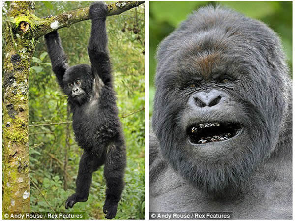 大猩猩喜欢群居,成员数量在5到30只之间。左图中,一只大猩猩正在荡秋千。右图中的银背大猩猩来自于大猩猩群“克维托达”,看上去并不友善。