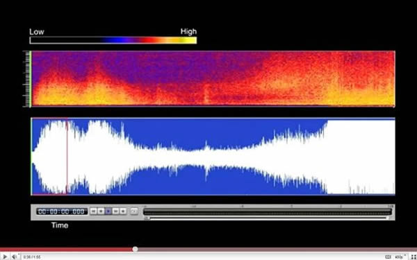 这段录音在You Tube上可以找到,它的速度被人为加快了16倍,在后半时,地震发出的声音几乎被位于数百英里深的海下地壳运动发出的噪音所湮没。最初发出爆炸声的是纵波P波(P-wave),它代表的是远震测量中的“首”波。噪音音量位居第二的是T波,又称三次波(tertiary waves)。海下发生地震时就会产生三次波。它们是三种波中最短的一种,当地震能量向上冲击时,就会形成这种波。在这个过程中,地震能量会转变成声能。