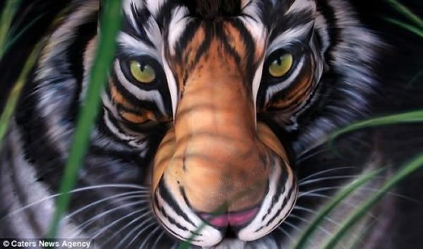 此次,克雷格挑选了三名美女志愿者,让她们在自己的工作室里摆好姿势,然后找来专为人体皮肤设计的颜料。他用24小时创造了这副人体虎图彩绘,而这只“老虎”正是中国濒临灭绝的华南虎。