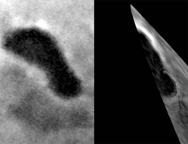 这是卡西尼探测器从1100公里高空拍摄的土卫六照片。右侧图像显示的一个被命名为“安大略湖”(Ontariou Lacus)的大型湖泊。在湖的下方甚至可以隐约分辨出海滩地带。左侧是2005年拍摄的另一幅该湖泊的图像。