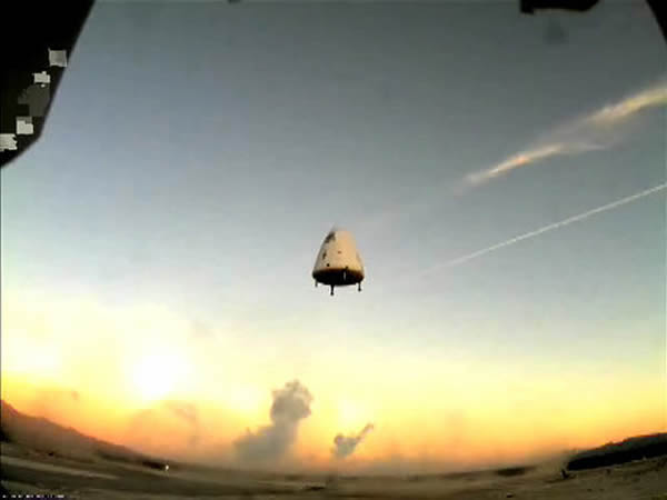 这是蓝色起源公司演示的垂直发射型圆锥载人飞行器设计概念。照片拍摄于2006年11月13日进行的一次测试飞行中