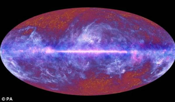 欧洲航天局普朗克卫星拍摄到整个太空的微波辐射,斑驳的黄色区域是大爆炸后留下的宇宙微波背景辐射,也许那时宇宙仅是一个维度
