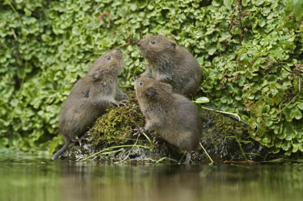 三只年幼的水鼠正聚集在河岸上。