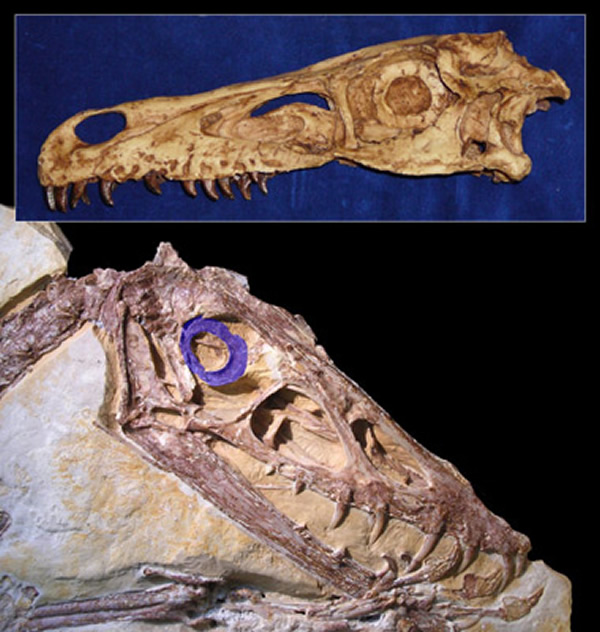 相对于猎鹰般大小的翼龙属掘颌龙(Scaphognathus crassirostris)的眼眶大小,其所具有的形状和内直径相对较小的巩膜环表明(主图中紫色所示),这种能够飞行的爬行动物只有在强光下才可形成良好的视觉。