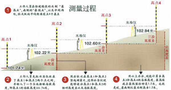随后,他要求工作人员从北向南设立4个水准基点。“我们要测出4个位置的水平数据,然后,才能算出哪边高哪边低!”之后,工作人员架起电子水准仪。半个小时后,测算结果出来下坡(南侧)比上坡(北侧)高出1.2米(指海拔高度)。