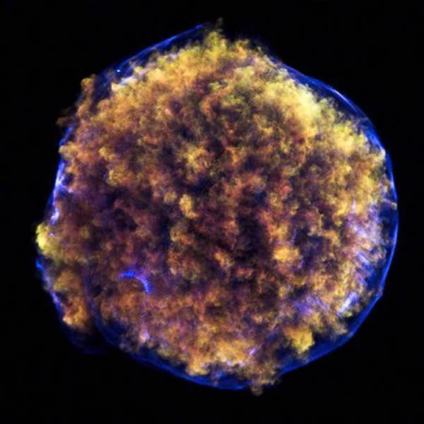 爆炸产生的碎片被称之为“第谷超新星残余”,外形好似马勃菌,不断扩张的碎片(黄色)形成一个云,外面包裹着高能冲击波(蓝色)。这幅图片表明,高能X射线弧(左下方)似乎来自于一个移动速度更快的物质球。天文学家认为,超新星在白矮星吞噬伴星爆炸后喷射的大量物质时形成。爆炸将大量物质喷向这个类日同伴,碎片放射出X射线弧。