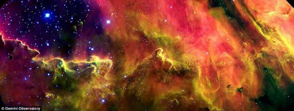 因此,这里的这张图像显示的并非真实色彩。比如,图像中的蓝色代表远红外光线,但这个波段的光线人的肉眼是看不到的。拍摄这张照片的南双子望远镜位于智利安第斯山区。