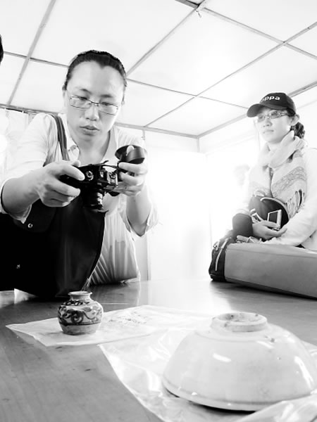4月27日,在“南澳Ⅰ号”打捞船“南天顺”上,记者正在拍摄前一天出水的青花弦纹碗和青花花卉纹小罐。