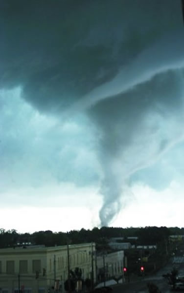 龙卷风是一个猛烈旋转着的圆形空气柱,它的上端与雷雨云相接,下端有的悬在半空中,有的直接延伸到地面或水面,一边旋转,一边向前移动。发生在海上,犹如“龙吸水”的现象,为“水龙卷”;出现在陆地上,卷扬尘土卷走房屋、树木等的龙卷,为“陆龙卷”。中央气象台首席预报员杨贵名说,远远看去,龙卷风像吊在空中晃晃悠悠的一条巨蟒,而且很像一个摆动不停的大象鼻子。