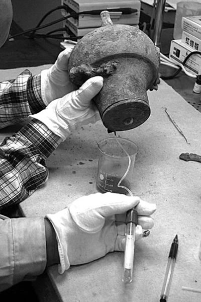 经过6个小时的取样,先后从铜壶内抽取液体30毫升。“有一点芳香气息,还有酸酸的味道!”现场专家称,古代有个成语叫“狗猛酒酸”,是比喻这个酒放的时间长了,它发出的那种酸味。西汉多为粮食酒,酿造过程和醋差不多,这个液体是酒的可能性非常大。随后,该液体样品由省、市文物人员专程送往北京质谱中心进行权威鉴定。