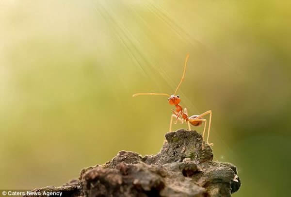 家住印尼首都雅加达的苏迪亚姆库说:“我省吃俭用买了微距设备后,9月才开始进行微距摄影,不过我希望尽我最大可能拍摄最好的蚂蚁照片。然而在我刚刚对自己降低要求时,那只蚂蚁突然单腿着地,摆出霹雳舞的姿势。我自己从未跳过霹雳舞,但是看到那只蚂蚁的动作,我立刻就想到了它。我第一次就拍到如此精彩的照片,恐怕以后很难有所超越了。我们一群人聚在一起,寻找拍摄微距照片的最佳时机时,我拍到这些令人难以置信的照片。由于是第一次,我特别期待拍到好照片,为此我站在暴风雨里等待太阳出来,等待蚂蚁重新从巢里爬出来。”