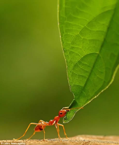 29岁的苏迪亚姆库利用佳能40D相机和100毫米口径微距镜头拍到这些令人惊叹的照片,他说:“我非常喜欢蚂蚁,因为它们勤劳勇敢又独立,蚂蚁群体很团结,它们一起工作,整个群体生活在一起。在较大蚂蚁群中,那些没有生育能力的雌性担任工蚁、卫兵或其他职务。这些小东西非常迷人。” 苏迪亚姆库展示的这些蚂蚁都是在自然光下拍摄的,因为激怒它们会产生不好后果。它们拥有毒刺,人被蜇到后会产生灼烧感,它们也因此得名。另外,火蚂蚁会利用螯死死抓住猎物不放,因此它会多次叮咬猎物。经常有数十万只火蚂蚁生活在同一个巢里,而且有时会有多个蚁后。美国每年投入多达500万美元用于消灭火蚂蚁,治疗被其蛰伤的患者。