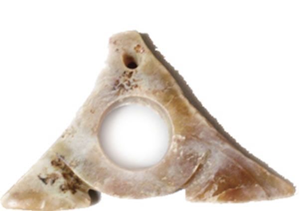 这件圆和弧边三角形组合的玉器“个头”比较小,和幼儿园小朋友玩的雪花片差不多大,外表呈三角形状,三条边线长约6厘米、略有弧度,在三角形的中间有个直径约为1厘米的圆孔。