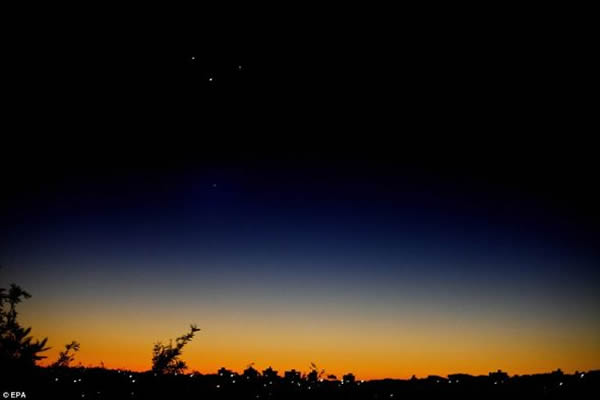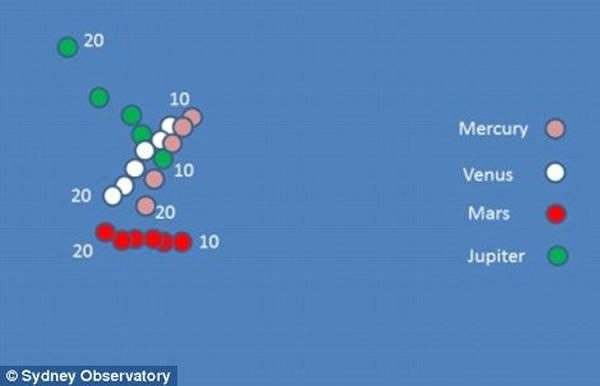 早晨在悉尼的天空看到,金星(中)附近出现了通常在傍晚才会出现的木星(左)、水星(右)和火星(下),这种众星聚首的现在要到2040年后才会再次出现。