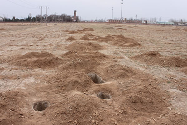 在瀍河区小李村,村口不远处一块约400亩的土地上,百余个盗洞散布田间。上官敫铭 摄