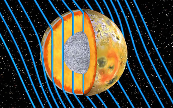 木星的卫星木卫一在其火山泛滥的表面下蕴含着一个环绕整个星球的熔岩池。研究人员在5月12日的《科学》杂志网络版上报告了这一研究成果,这是对曾环绕木星运行的伽利略号探测器在10年前获得的数据进行再次分析后得出的结论。长期以来,理论学家一直预测木星巨大的引力必定在木卫一上引发潮汐,进而蹂躏着其依然为固态但却可变的岩层,并最终产生热量直至将其内部部分熔化。行星地质学家曾在这颗卫星表面的火山岩浆中发现了痕迹,表明木卫一上100个已知火山热点区域是由深处的岩浆“海洋”所供给的。然而在高空飞扬的火山灰却阻碍了空间物理学家尝试利用木星强大的磁场探测木卫一内部构造的努力。如今,研究人员报告说,他们扫除了所有干扰,最终发现了一个磁信号,而这种信号存在的前提是木卫一的岩层外壳下包含了一个能够导电的50千米或更厚的岩浆层——或是充满结晶的岩浆泥(图中橙色薄层所示)。这一发现不禁使人联想起了太阳系最初的日子,当时大多数大型的岩石天体都蕴含着一个岩浆的海洋,直到它们最终冷却下来。