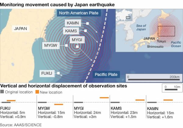 设在陆地上的GPS基站测量到日本本岛在地震中向东南方向出现了位移,这些数据随后也被用来对日本外海海底的位移情况进行估算。