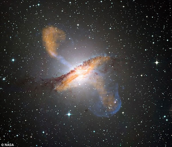 这是从半人马座A星系中心的黑洞喷发出的物质和无线放射波瓣