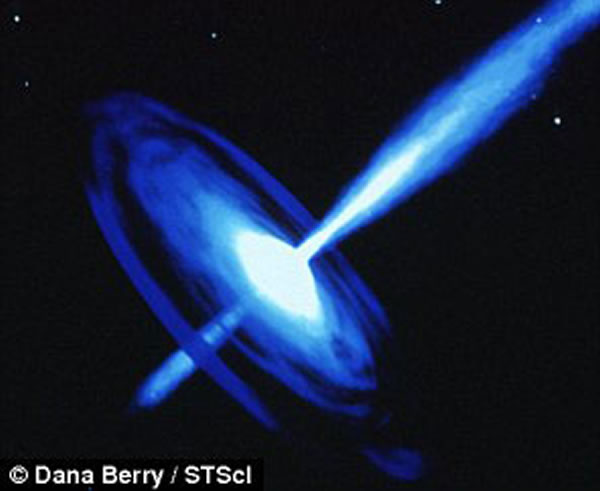 这个巨大黑洞向外喷发很多发光粒子,且旋转速度要大于宇宙历史中的任一时刻
