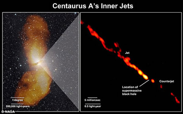 据悉,黑洞的这些喷射物会与周围的气体相互作用,同时还有可能改变星系中行星的形成速度,可以说这些喷射物对于研究银河系的演变和形成起到至关重要的作用,但是它们的形成过程迄今却仍是个谜。天文学家还观察到,这些喷射物急流底部附近的物质,会以三分之一光速向外喷发。下降到巨大黑洞中的气体会使半人马座星系放出巨大的能量。尽管天文学家还没有弄清楚喷射物产生的过程,但他们了解到,这些降落的物质会大量的从相反方向喷发而出,并且会以光速高速运动。