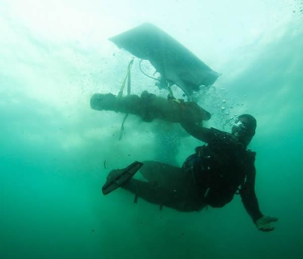 照片于2010年在巴拿马拍摄,最近对外公布。照片中,巴拿马潜水员乔·勒伯莱尽力让一门17世纪的加农炮稳定上升,在气袋的帮助下,加农炮慢慢从查格雷斯河河口附近的海床浮上水面。据信,这门加农炮的主人就是17世纪的海盗船长亨利·摩根。在后世眼中,摩根成为“残忍”的代名词。据悉,考古学家共发现6门17世纪的加农炮。