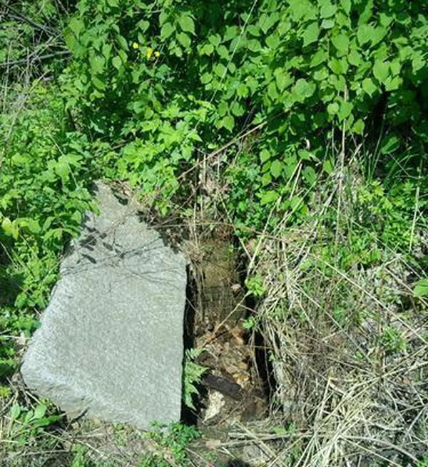 距墓碑后侧是一处密林,进入林内约20米远的一棵枫树下,墓室的两块青石板的一块敞开着。“这块青石板是被人撬开的,所以墓内肯定被盗过多次,物品早已丢失。”皮福生说,盗墓贼下了不少力气,将几百斤重的石板撬起,留下一个宽度仅半米宽的缝。