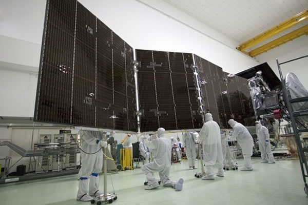 美国宇航局下属的喷气推进实验室近日公布:新一代木星探测器——朱诺号(Juno)在完成太阳能电池板等关键系统测试后,标志着探测器发射准备任务抵达一个里程碑式的节点,将于今年八月发射升空,并利用地球引力进行加速,预计2016年进入木星轨道,在一年多的时间里对木星上大量天然气起源之谜、木星大气结构、地层构造以及磁场情况进行详细的探测。