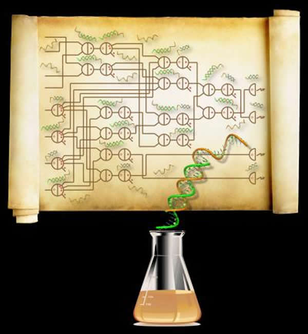 从很多方面来说,生命就像一个计算机。一个生物的基因组就是软件, 告诉作为硬件的细胞和分子机器如何运作。不过生命不依赖于电子电路,而是依赖于生化电路——使生物具有活力的反应和通路组成的复杂网络。如今,加州理工(Caltech)的研究人员构造出最复杂的、每一个元件都是设计合成的生化电路,不是用计算机芯片上的电子晶体管,而是用试管里的小DNA分子器件。
