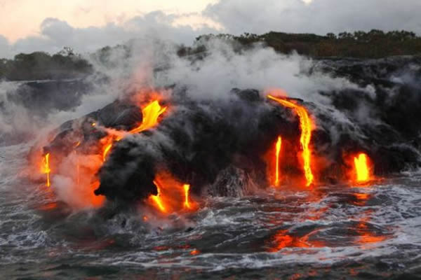 炙热的熔岩从夏威夷大岛的硬化熔岩壳下方涌出,流入海洋。(图片提供:Patrick McFeeley, National Geographic)