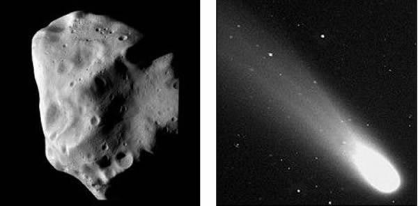 太阳系的建筑材料:左侧是欧洲罗塞他探测器拍摄的鲁特西亚小行星,右侧是池谷-张彗星,这颗彗星于2002年由我国河南天文爱好者张大庆和日本彗星猎杀池谷熏共同发现