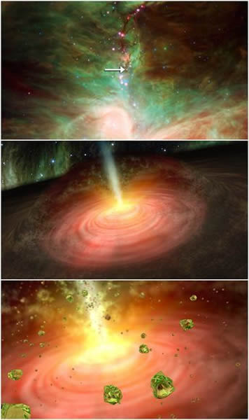 美国国家地理一周太空图片精选:NGC 6744星系 来源: 神秘的地球 时间:2011年6月08日 16:59 5.美丽的绿晶雨 美丽的绿晶雨(图片来源:T. Pyle/SSC, Caltech, NASA ) 美国宇航局表示,这些绿色晶体可能落向婴儿恒星HOPS-68(顶部图片中箭头所指位置)。根据斯皮策太空望远镜进行的红外观测,这些晶体被一颗年轻的原恒星以喷流的形式喷出,而后像雨一样落到HOPS-68表面。中图和底图均为艺术概念图。 新浪环球地理(孝文) 上一页12345 上一篇 下一篇