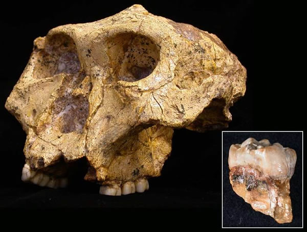 南方古猿的牙齿(小图)表明女性背井离乡的几率远远高于男性。(图片提供:Darryl de Ruiter;Sandi Copeland)