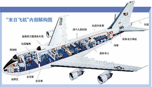 在电影《2012末日预言》中,美国一批政要乘坐一架总统专机逃难,而“末日飞机”则是这架飞机的现实版。美国空军近日罕见地透露“末日飞机”的内部情况,指出就是面临核战、陨石袭击地球等“末日环境”,它配备的防护装置也可以保护飞机上的政要。