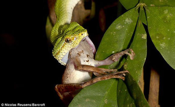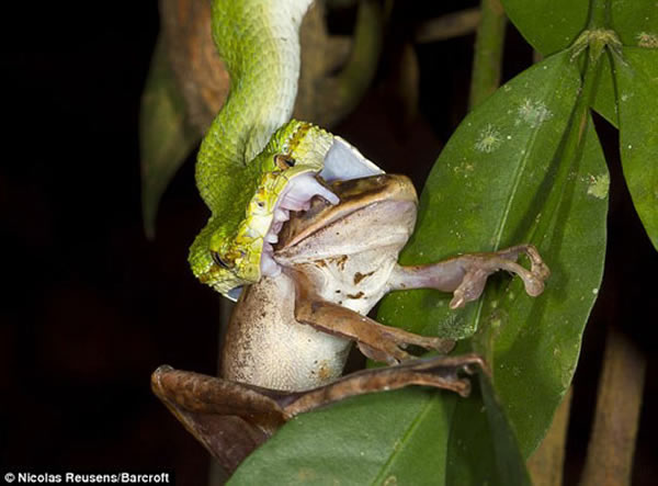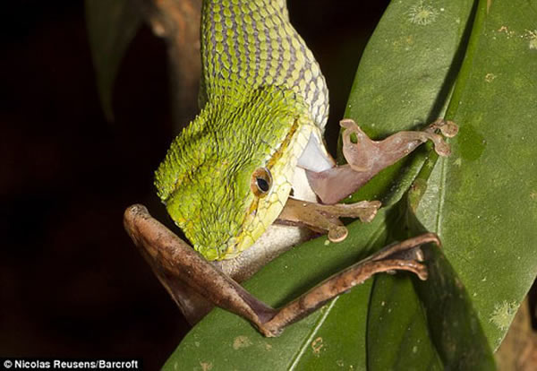 雷桑斯在接下来的几分钟内观看响尾蛇将树蛙吞食的全过程。婆罗洲是马来群岛的一部分,是世界上第三大岛屿,由于该岛屿植物和生物多样性,成为专业和业余野生动物摄影师最向往的地点之一。