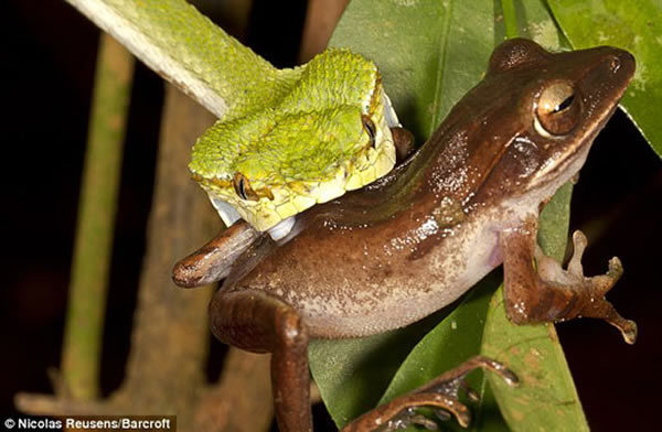 响尾蛇将尖牙刺入树蛙的身体,想将树蛙整个吞入口中