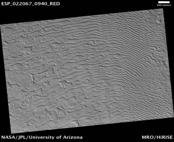 美国宇航局公布火星最新照片 来源: 神秘的地球 时间:2011年6月14日 11:17 7.火星南极冰帽 火星南极冰帽 这幅照片呈现的是火星南极冰帽的一部分。每年春季,冻结的二氧化碳直接从固态变成气态,在冰帽上形成怪异的图案。通常情况下,这些图案非常接近圆形,因为南极各个方向照射到的阳光相同。但在这幅照片呈现的冰帽,这些图案却呈线状,行星科学家将其形象地称之为“指纹地貌”。这种地貌是被薄霜层或者松散冰晶覆盖的沙丘,冰晶像沙粒一样弹跳,在波纹中聚集。HiRISE照相机自2007年以来便对这种地貌进行观测,观测发生的变化同时确定这些怪区正在上演什么活动。 上一页12345678910下一页 上一篇 下一篇