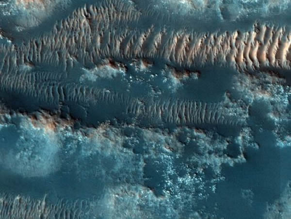火星罗伯谷(Lobo Vallis)暗淡的沙丘和波纹。风穿过这个山谷,速度很快,足以卷起沙子,将它们吹到其他地方。HiRISE照相机拍摄的这幅照片所呈现的并非火星真实面貌,这是一幅伪色照片,用以突出有趣的地貌特征,同时赋予人类肉眼看不到的波长光线颜色。照片中,红外线呈红色,人类肉眼看来呈红色的区域在照片中呈绿色,蓝绿波长则呈蓝色。