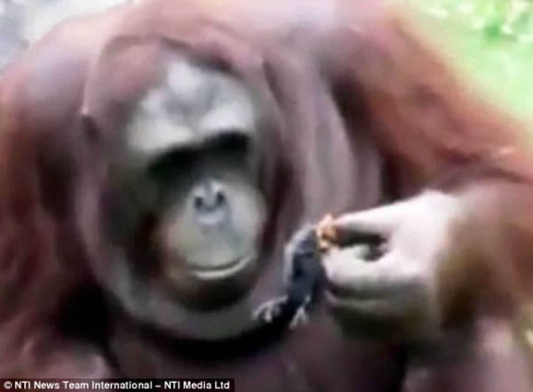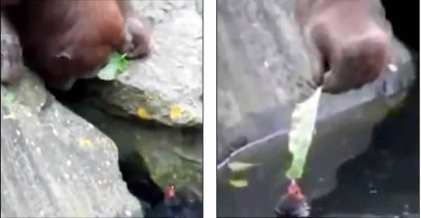 一位游客在一家名字不详的动物园拍摄的这段5分钟的录像,开始是这只大猩猩坐在一块石头上,很快它看到下面的池塘里有一只小鸭子,于是它就走近池塘,以便看清楚一些。好像是意识到小鸭子有麻烦,它从附近的树丛上揪掉一片树叶,放在小鸭子嘴边。这片树叶对小鸭子来说无疑是一根救命稻草,它拼命想要咬住它。