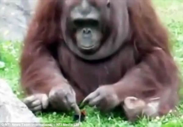 猩猩把树叶当作浆,用它划水,让小鸭子漂到它附近,然后用巨大的前爪把小鸭子从水里捞起来,这使围观的游客很吃惊