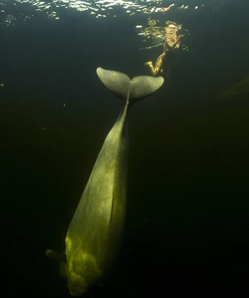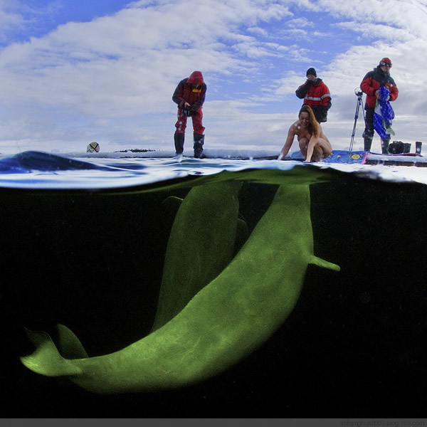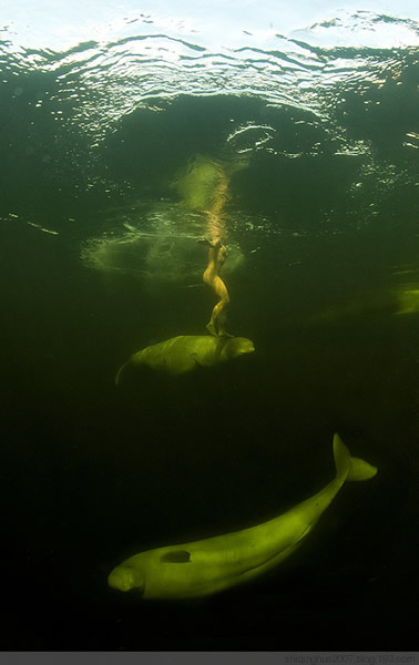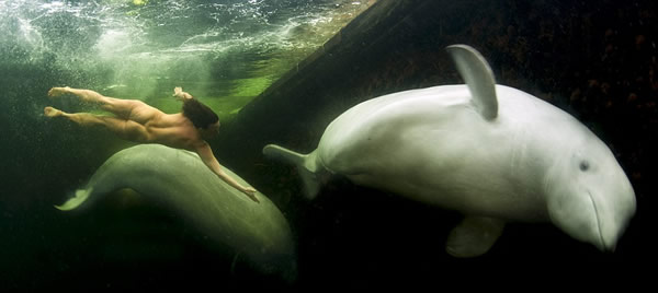 娜塔利娅与白鲸一同嬉戏的场景,让人不禁感叹眼前的场景如油画一般美丽。