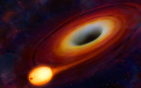 3月28日,美国宇航局的雨燕卫星观察到了一簇伽马射线的闪光,这道闪光比天文学家之前发现的任何记录都要亮。事情随即变得很明白——这并不是一个典型的伽马射线暴发,后者是通常伴随着一次超新星爆发而释放出的高能辐射。这道闪光并没有迅速消失,而是持续了几周的时间,并且尽管它的强度逐渐减弱,但在两个半月后却依然强劲。6月16日发表在《科学》杂志网络版上的两篇论文对这道令人惊讶的光给出了一个解释。这道闪光实际上是当一颗恒星坠入位于40亿光年之外的一个星系中央的一个黑洞时产生的高能辐射流。而闪光之所以如此耀眼的原因在于辐射流的方向恰好直指地球。而它之所以维持了很长时间则是缘于黑洞正在逐渐吞噬这颗恒星。其中一篇论文的首席作者、美国加利福尼亚大学伯克利分校的天文学家Joshua Bloom指出:“这是因为随着黑洞将恒星撕裂,周围的物质随之打旋就像水在一个下水口打旋渗漏,并且这种涡流过程释放了大量的能量。”Bloom预计,这道闪光可能会在未来一年中逐渐淡去。