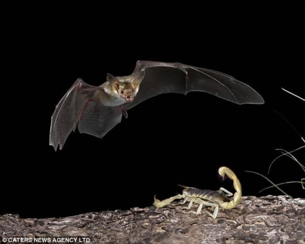 这是一张令人印象深刻的照片:黑暗中,一只蝙蝠悄无声息地盘旋而下,直扑向一只蝎子:它的猎物。在照片中,你可以清晰地感受到这只冷血蝙蝠的力量和隐身技巧。