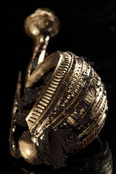 2011年3月拍摄,展现了在凯尔特贵妇墓葬中发现的黄金首饰。这件首饰做工细致,图案精巧,主人应该是铁器时代的一名公主。此项考古项目联合负责人、斯图加特地区委员会考古学家妮可-伊宾格-里斯特表示,这座贵妇墓葬的附近便是一名女孩的墓穴,距今年代类似,是在2005年发掘的,其遗骨上的配饰与这名贵妇几乎一模一样。她说:“令人感到吃惊是,这名女孩身上的珠宝首饰——两个饰针和两个耳环——几乎与这名贵妇的完全相同。她们之间一定存在联系。”研究小组希望DNA分析能够揭示出两人之间的关系。她们可能是一家人,甚至有可能是母女关系。